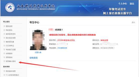3、 进入考生中心页面。点击“报到确认查询”,如下图:
