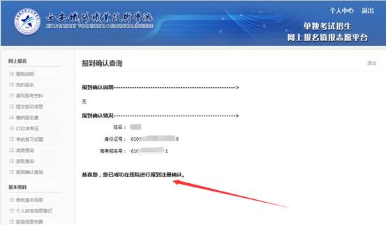 如看到“恭喜您,您已成功在我院进行报到注册确认。”即表示,您已报到注册成功。如下图: