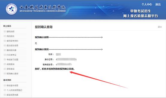 如看到“您好,系统未检测到您的报到确认信息”。即表示,您没有报到注册成功。请及时联系学院招生咨询处029-82150253 82150309,如下图: